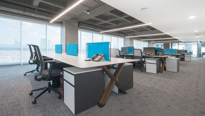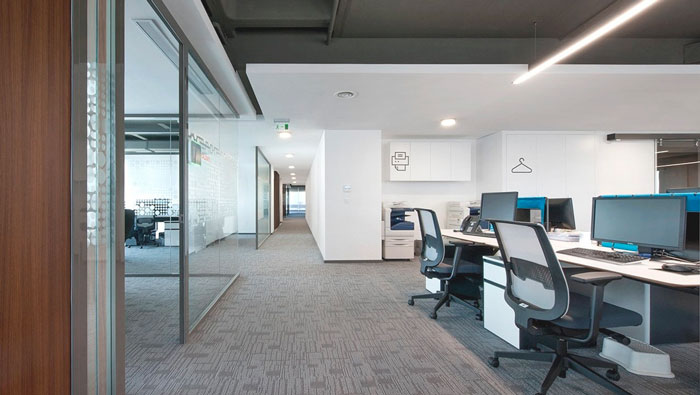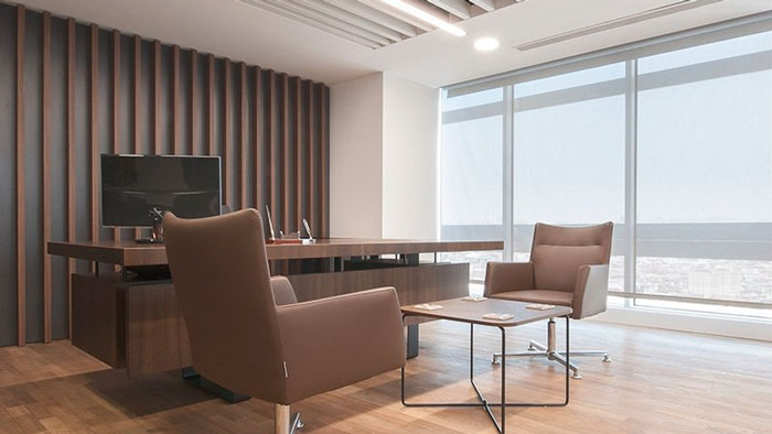 辦公區域的設計:整個空間給人的第一感覺就是大氣,這也是設計師對金融辦公室的第一印象,在設計師眼中金融一定與錢有關,也只有這樣的格局才能彰顯企業的實力,如此一來才能取得客戶的信任,同時大氣、簡單的空間,也讓員工的辦事效率如魚得水。