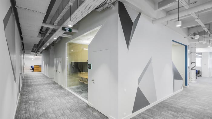 辦公區域的設計:此處是其中一個部門的辦公場地,設計師在辦公工位的設計中,將每一步部門按照不同的屬性分割在空間的每一個角落,這樣做好的好處就是保證為每一個員工都提供優質的辦公工位,不會出現人員扎堆的想象發生,即保證了空間的通暢也為每一個部門都保留了自己的空間。