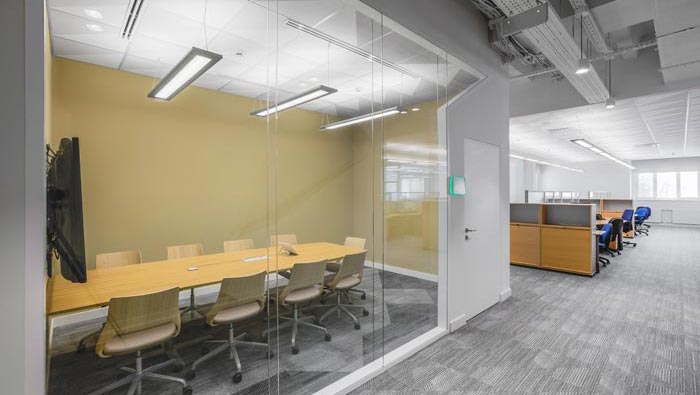 小型會議室的設計:這樣的空間還有好幾個,幾乎在每一處辦公區域的附近都有一個,這樣就是為每一個辦公區域都配置相應的輔助空間,這樣展現出企業的管理模式,部門與部門之間分開管理,這樣的好處就是減輕上層領導的壓力,同時關注到每一個人。
