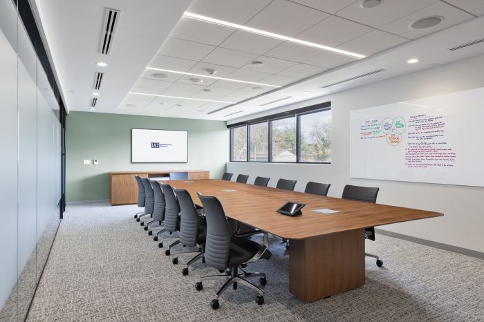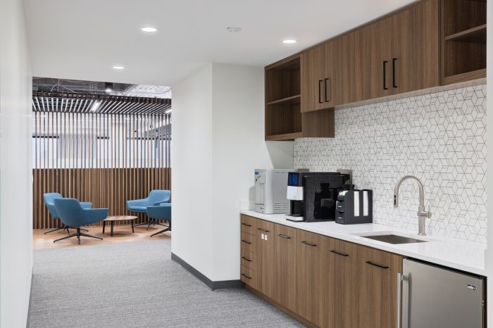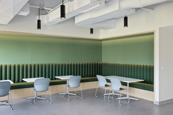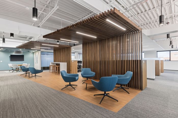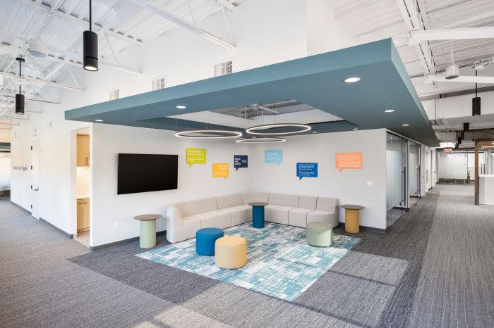 設計優化了整體空間,以兩個開放式樓梯為中心。第二層側重于工作空間,第一層主要以公共空間為主,設計師提供了協作解決方案,其中包括一個帶有可移動隔板的培訓室和休息室。這個空間可以讓全國的團隊進行培訓活動。