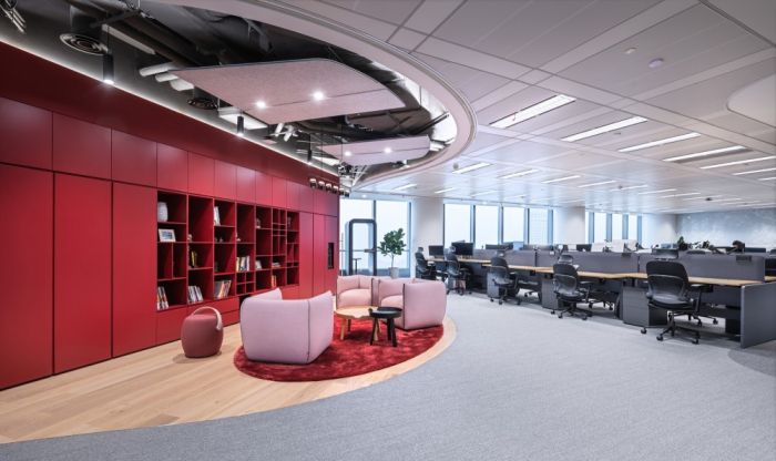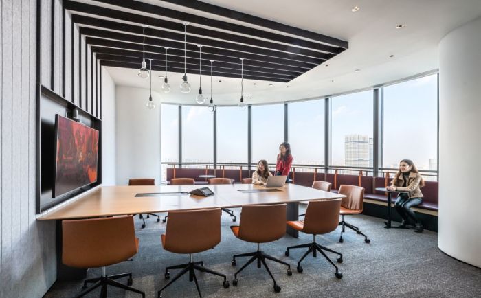 辦公室采用多種類型和形式的燈光,包括地面、吊燈和桌面燈光,以呈現(xiàn)明亮、充滿活力的工作文化。辦公室還運(yùn)用了中國傳統(tǒng)文化元素,如靈感來源于中國古代故事的地面和家具設(shè)計(jì),以及以中國農(nóng)歷年為靈感的室內(nèi)裝飾。 辦公室還強(qiáng)調(diào)了與本地社區(qū)的聯(lián)系,通過標(biāo)志、裝飾和環(huán)境藝術(shù)作品等方式運(yùn)用了中國傳統(tǒng)文化的符號、顏色和字體。此外,辦公室還注重環(huán)境友好和員工福利,包括提供全景視野的餐廳和社交區(qū)域,以及可調(diào)節(jié)高度的辦公桌。