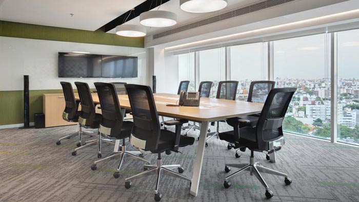 會議室的設計:設計師在設計的時候,將其安置在靠近窗戶的空間區(qū)域中,在設計師看來會議是企業(yè)發(fā)展所不可替的,但是設計師希望可以改變會議室給人枯燥、無味的感覺,故此設計師將采光、室外景色通過設計的手法將其引入室內(nèi),讓會議變得有趣起來。