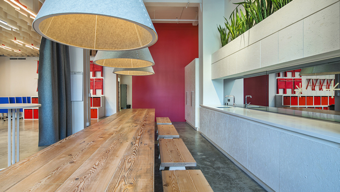 交流區(qū)域的設(shè)計(jì):當(dāng)桌椅收攏起來(lái)之后,此處空間就擁有了更多的可能,這也是設(shè)計(jì)師設(shè)計(jì)的初衷,椅子被懸掛在墻體之上,儲(chǔ)藏柜按照層級(jí)依次向上,一方面可以在此處休息,另外一方面也為掛取椅子提供了保障,可折疊的桌子以此排列在儲(chǔ)藏柜的左側(cè),當(dāng)桌椅被收攏之后,被設(shè)計(jì)師巧妙的設(shè)計(jì)為空間的點(diǎn)綴物。