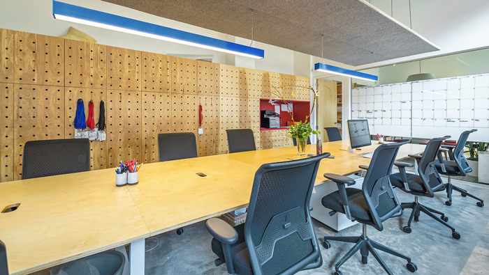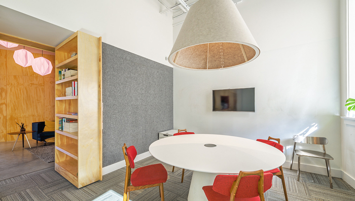 小型會(huì)議室的設(shè)計(jì):我們首先看到的就是一個(gè)機(jī)關(guān)門,在外看是一個(gè)書架,往內(nèi)推開卻是另有一番天地,這也是設(shè)計(jì)師設(shè)計(jì)中的一點(diǎn)點(diǎn)小趣味,在設(shè)計(jì)師看來(lái)趣味是辦公中的調(diào)劑,設(shè)計(jì)師希望員工在辦公中不是一成不變的,而是幽默、活躍、有趣。