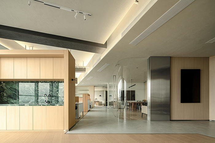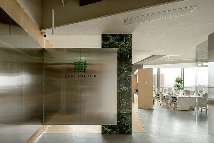 企業(yè)產(chǎn)品專注可持續(xù)性人工種植,主設(shè)計(jì)師對此表達(dá)為生態(tài)的感觀,提煉企業(yè)產(chǎn)品紗線最源頭的木材做為空間木飾面,同時(shí)希望在水泥墻面的深淺交錯(cuò)的映襯。