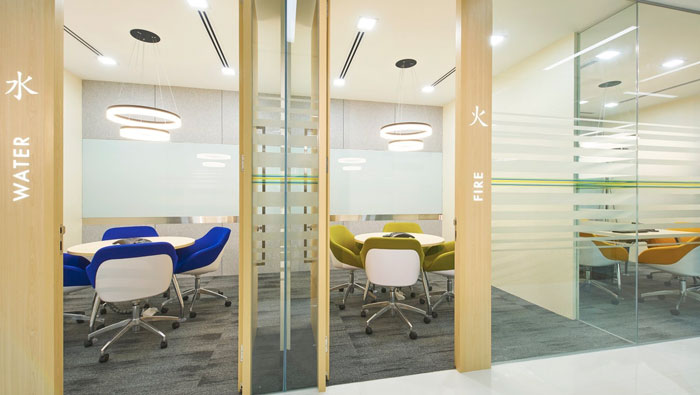 接待區域的設計:因為企業業務的私密性較強,故此對于接待區域的私密性就有很高的要求,每一個接待區域都是由隔音玻璃組成,這樣是為了打造絕對安靜、隔音的空間,同時設計師以水、火、木、金、土對5個接待區域進行命名,這樣的命名即好記也有循環往復的含義。
