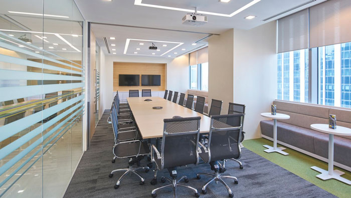會議室的設計:此處結合了會議室與交流區域,這也是設計師偶然的突發奇想,窗邊的交流區域,在會議開展的時候可以容納更多的會議人員,在平時也可以做為與客戶之間的交流區域,設計師的設計理念就是處處都是實用的,處處都是一種生活的態度。