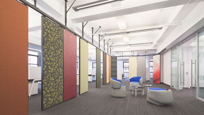 辦公區域的設計:懸掛的隔斷如一扇扇門將辦公區域擋在視線之外,但懸掛的隔斷不是死的而是靈活的,一扇扇可拉可合,開放的辦公區加上半封閉的個人辦公區,兩者之間形成一個很好的結合,這樣的設計旨在消除弊端,同時也在為企業營造利于發展的辦公新格局。