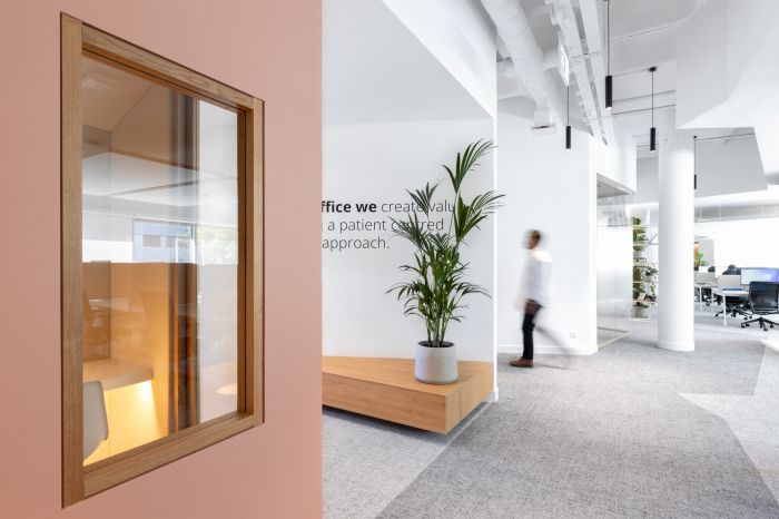 這是一個700方的辦公室,業(yè)主是一家從事醫(yī)藥行業(yè)的公司。設(shè)計師把工作區(qū)分為三個區(qū)域:一個安靜的區(qū)域,員工可以進行個人工作;一個動態(tài)區(qū)域,員工可以單獨工作或者與同事互動;以及一個協(xié)作區(qū)域,團隊可以在這里進行會議,進行團隊討論。