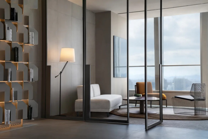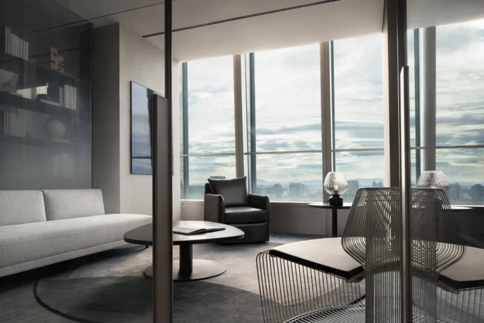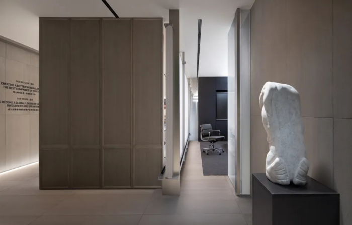 走廊承擔休息與公司分享的場所,活動的多重舉辦賦予其多重身份,以體塊成為空間審美品質的鋪墊。多重的東方元素,在體塊空間的對稱與縱深中, 成為銜接東方美學與現代質感的橋梁。