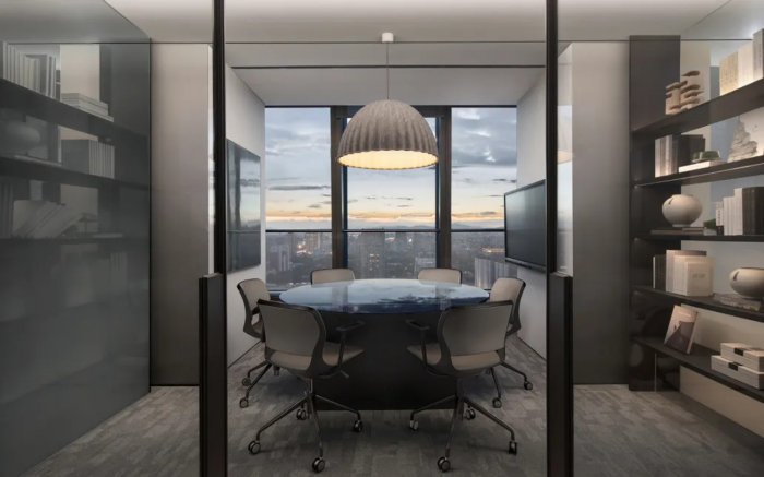 這間辦公室擁有500方的面積,業主是一家享譽業界的金融公司。設計師使用新中式的風格,展現了東方的視野,設計始終保有空間的溫和與優雅。雕塑化的造型、理性的結構美、簡 雅的線條感,極簡的空靈和厚重的現實得以結合。