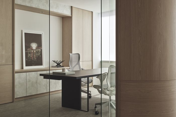 這是一個(gè)冷淡風(fēng)的辦公室,辦公空間從入口到室內(nèi)內(nèi)部,每一個(gè)元素都給用戶提供了一種幸福和平靜的感覺。空間內(nèi)部整體為開放式辦公室,區(qū)域或者隔間中使用百葉窗和藤條屏風(fēng)進(jìn)行分隔。