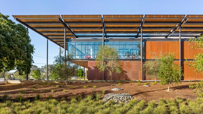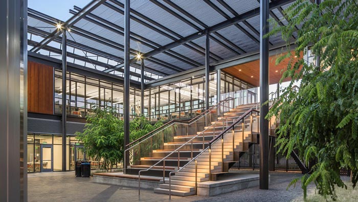辦公樓進門區域的設計:頂部折疊的設計,可以將強光擋在遮光板之外,讓光經過阻擋后變為柔光,這樣的轉換讓人可以免受強光的照射,同時遮光板也有吸收太陽能的作用,經過專業設備的轉換,為日常照明、工作提供了免費的電源,設計與設計之間環環相扣,讓廠房自身的節能趨于完美。
