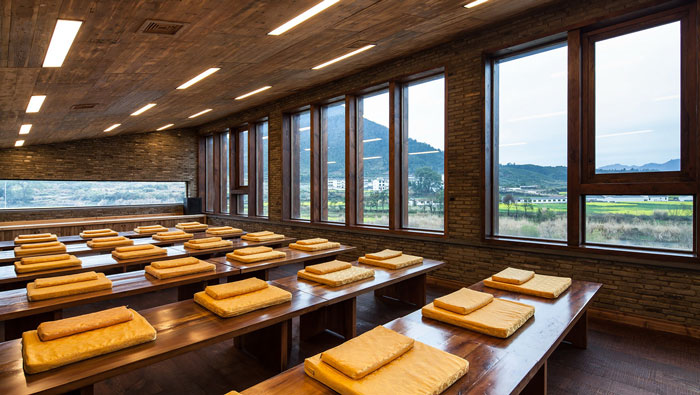 廠房入口裝修設計:斜坡式的建筑增強了建筑的排水能力,同時與周圍的山勢相互融合,讓建筑與自然融為一體,門、窗的設計,也可以看出室內設計師,也持同樣的態度。
