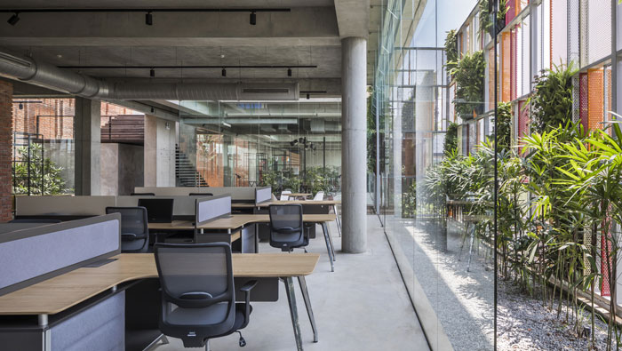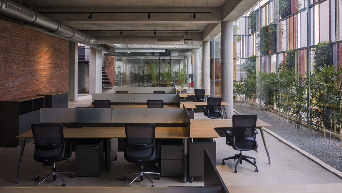 本次為工廠辦公大樓辦公室裝修設計效果圖,辦公室設計面積4000平方,設計師在辦公室設計中,以現場環境保持一致為前提,目的就是打造一個融合與廠房的辦公樓,而不是一個獨立的裝飾。