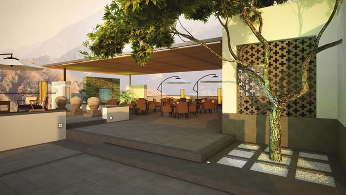 天臺的設計:此處位于酒店的樓頂,此處也是設計師實地考察之后得出的靈感,設計師在站在樓頂的時候,看到的是一看眾山小的豪情,故此設計師靈光一閃將此處設計成交流、休息、觀賞區,讓顧客可以在這里欣賞到不一樣的景色,體悟不一樣的美。