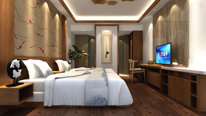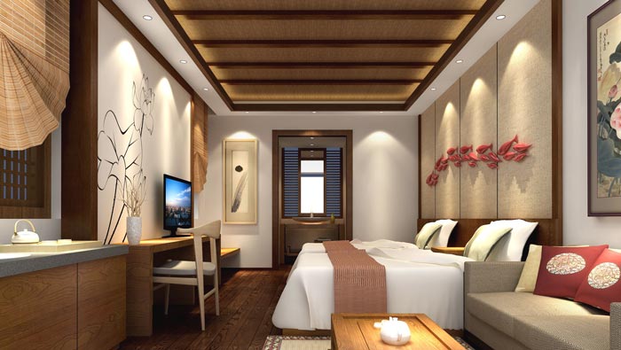 客房的設計:當顧客拖著疲憊的身體回到房間之后,最希望的就是躺下好好休息一下,這樣一來空間的氛圍就十分重要,而中式家具本身就有治愈的能力,因為木代表著再生,用中式家具點綴的空間,讓人更容易進入深層次的睡眠,讓人在熟睡中得以快速的恢復疲憊的身心。