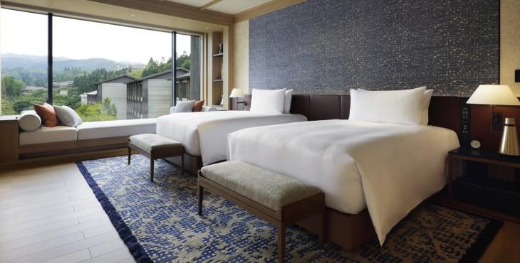整個酒店的室內設計與場地的自然環(huán)境相輔相成,這得益于設計事務所受到傳統(tǒng)日本色彩的啟發(fā),以溫暖的泥土色為空間基調。酒店客房區(qū)域,標準客房和套房的面積從50㎡到110㎡之間,雖大小不等,但都配置了舒適的沙發(fā)床和開放式概念浴缸,讓客人更好的體驗傳統(tǒng)京都里的泡湯文化。