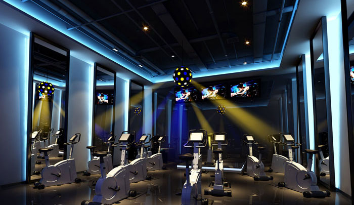 動感單車空間設(shè)計,設(shè)計師在此處采用了暗色作為主色調(diào),讓消費(fèi)者在此處可以體驗(yàn)到狂野、奔放的動感單車健身環(huán)境。