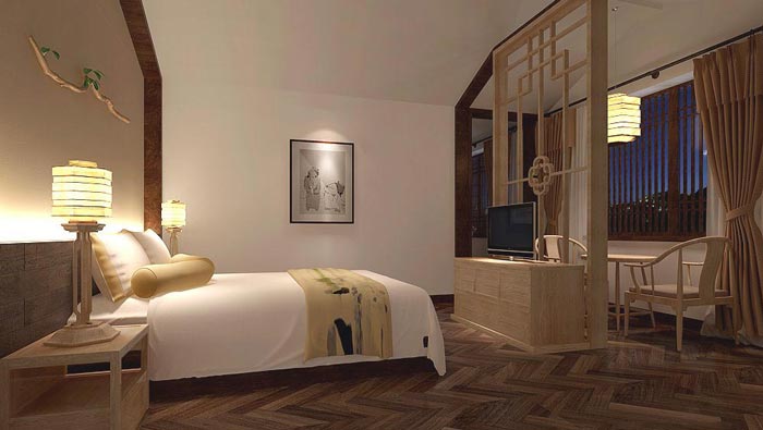 雙人套房的設計:在此處有一種家的感覺彌漫在空間之中,在設計師看來旅行要追求的就是生活的態度,旅行者在旅途中可以體味各種不同的風景與生活方式,這也是一種修行,一種心的修行,設計師希望在這里給顧客一種家的感覺,讓顧客在這里休息、修行。