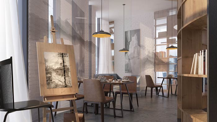 咖啡廳展示區(qū)裝修設(shè)計(jì):這里每天都會(huì)展示不一樣的繪畫(huà)產(chǎn)品,有復(fù)古的、有中式的、有西方的、有現(xiàn)代的,一個(gè)小小的展示區(qū),向客戶展示了不同時(shí)代、不同年齡的繪畫(huà)作品。