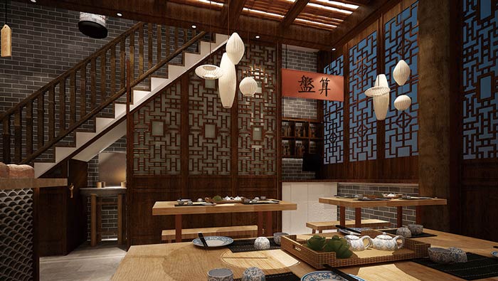 中式面館樓梯裝修設計:“客觀樓上請”,相信大家都不陌生,這在電視劇里面經常會聽到,但在現實生活中相信幾乎聽不到,這里有這個條件,讓客戶在這里親身體驗一次。