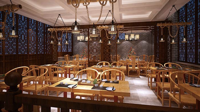 中式面館餐桌裝修設計:木制的餐桌餐椅,木制的門、木制的吊頂與柱子,整個空間就是一個木制的世界,這里的一切都重現了木的世界,在這里時間慢了下來、空氣清新了起來。