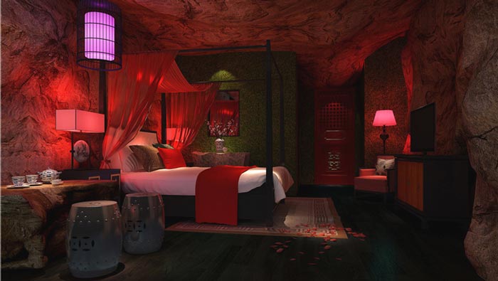 曠古奇緣客房的設(shè)計:相信每一個人都有一個穿越的夢想,都想穿越到過去用自己的本事,建造一份功業(yè)并遇到自己的紅顏知己,戀人們進入空間之后,就仿佛與現(xiàn)世脫離,穿越到了五百年前,在這里設(shè)計師希望戀人們可以真切的體驗一次古代的愛情,讓彼此之間的感情可以更上一層樓。