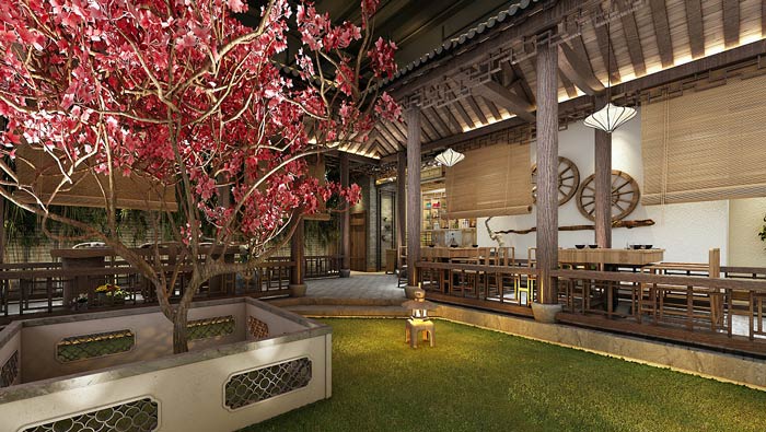 特色私房菜館花園設計:亭臺樓閣中的花園是空間中的一大亮色,這里自然的氣息非常濃郁,這里也是空間的中心區域,其他區域圍繞著花園,讓整個餐館空間充滿綠色。