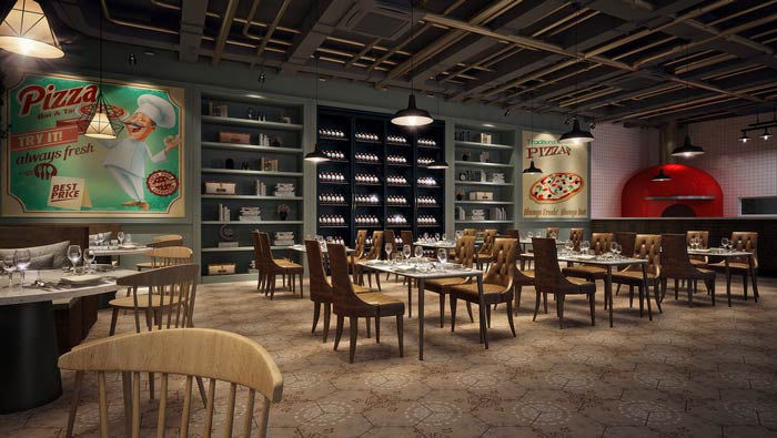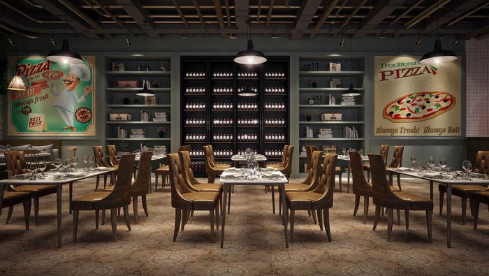 披薩西餐廳過(guò)道裝修設(shè)計(jì):T字型的過(guò)道連接了整個(gè)空間,之所以選擇T字型,這是根據(jù)空間的布局所決定的,這樣的設(shè)計(jì)可以將空間的任何地方加以連接,這是設(shè)計(jì)師需要看到的。