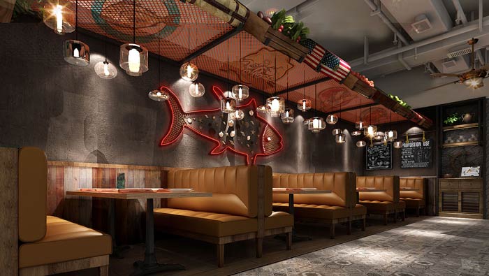 西餐廳海鮮餐區(qū)裝修設(shè)計(jì):墻上似乎有一條魚兒在搖曳,清楚明白的告訴客戶這里屬于海鮮餐區(qū),不同的食品配以不同的就餐環(huán)境,就是希望客戶可以身臨其境的,感受與之搭配的餐區(qū)設(shè)計(jì)。