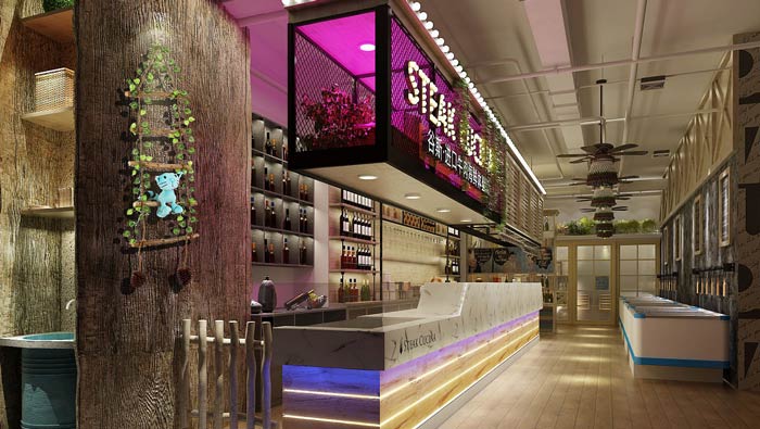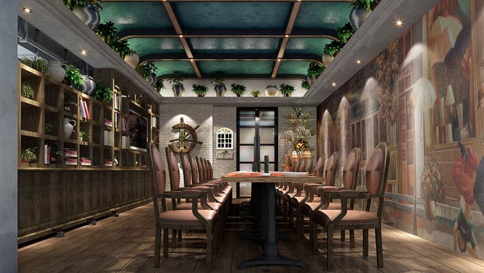 西餐廳前臺(tái)裝修設(shè)計(jì):工業(yè)風(fēng)、田園風(fēng)在這里得到很好的融合,讓客戶進(jìn)入空間,首先感受到的是自然氣息,自然氣息讓客戶焦躁的心靈得到有效的緩解,讓客戶吃的安心、吃的放心。