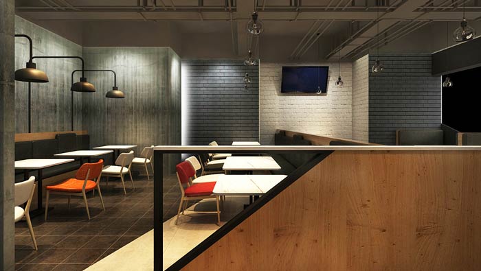主題西餐廳餐區裝修設計:餐區由兩人區、四人區構成,一左一右將空間很好的加以利用,在餐桌椅的選擇上,設計師以用戶體驗為導向,希望打造一個優質的就餐環境。