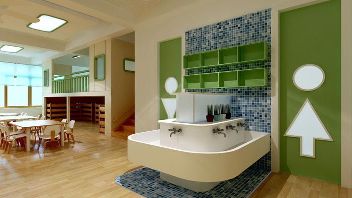 洗手區(qū)域的設(shè)計(jì):此處通往的是就餐區(qū),在洗手池的設(shè)計(jì)上,設(shè)計(jì)師對(duì)地面、洗手池都做了處理,目的就是為了避免因?yàn)樗斐傻牡孛鏉窕瑑蓚€(gè)門一個(gè)進(jìn)一個(gè)出,設(shè)計(jì)是希望可以從小培養(yǎng)孩子排隊(duì)的意識(shí),一進(jìn)一出之間也見證了教育的重要性。