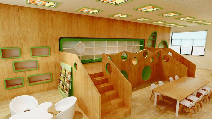 娛樂(lè)區(qū)域的設(shè)計(jì):此處與就餐區(qū)域融合在一起,當(dāng)就餐結(jié)束20分鐘以后,孩子們可以在這里盡情的玩耍,玩耍是孩子的天性,設(shè)計(jì)師希望可以將其進(jìn)一步的延伸,讓孩子在玩耍中不斷地成長(zhǎng),當(dāng)玩耍累了之后,孩子們可以坐在一起看看漫畫、圖書,課外生活也是一樣的精彩。