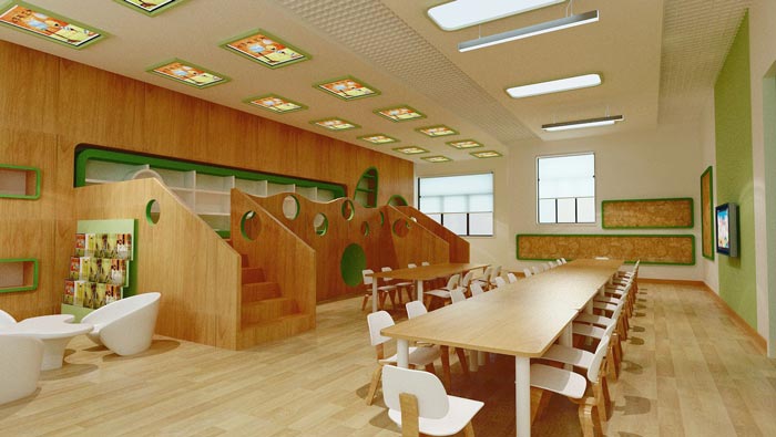 教室的設(shè)計(jì):此空間可以容納下30個(gè)幼兒,設(shè)計(jì)師在設(shè)計(jì)中希望將一切都加以精簡(jiǎn),從座椅的排列與選擇上可以看出,設(shè)計(jì)師的精簡(jiǎn)取得了效果,雖然人多了起來(lái),但是一點(diǎn)也不會(huì)顯得擁擠,設(shè)計(jì)師要做的就是兼顧實(shí)際需求與實(shí)用之間的平衡,為孩子打造一個(gè)舒適的學(xué)習(xí)環(huán)境。
