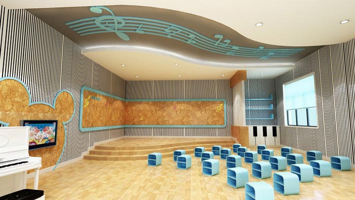 音樂(lè)教室的設(shè)計(jì):這里大致可以容納下30多個(gè)小朋友,也就是大概一個(gè)班多一點(diǎn)點(diǎn),能歌善舞是每個(gè)家長(zhǎng)對(duì)于孩子的特殊期望,對(duì)于孩子本身來(lái)說(shuō)也是一個(gè)不可不得的技能,在設(shè)計(jì)師看來(lái)若是引導(dǎo)得當(dāng),讓孩子喜歡唱歌、跳舞也不失為一件功德無(wú)量的事情。