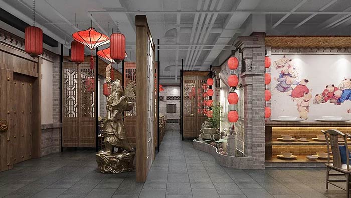 中餐廳過道設計:空間由一條主通道貫穿前后,空間左側擺放的是關公像,希望保佑餐廳可以順順利利,右邊是餐具區,墻繪表示的是小孩子玩耍的場景,讓客戶在這里尋回小時候的身影。