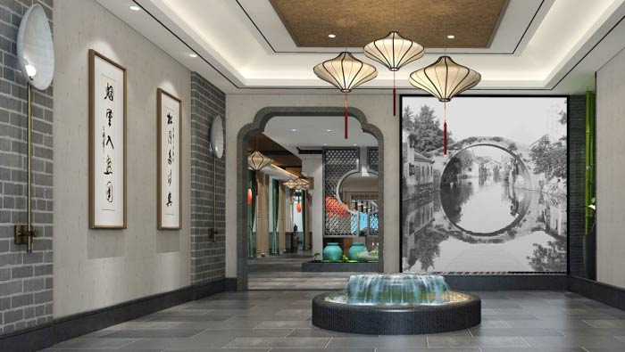 特色中餐廳中庭設計:此處做為進門區與內部空間的連接地,空間中有書法字體、有噴泉清水、有特色拱橋、有特色的燈飾,一切元素在空間中相互融合。