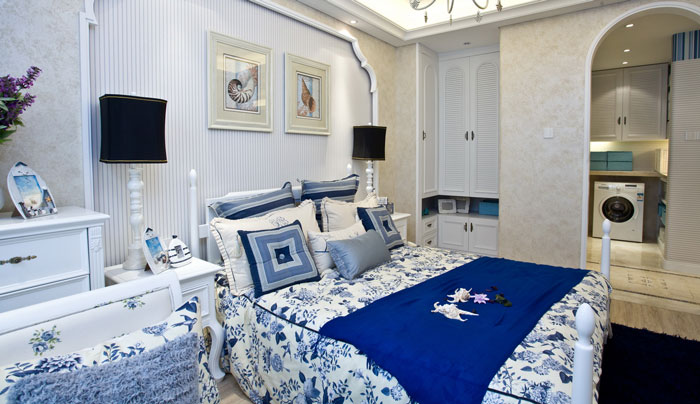 如馳騁在浩瀚的海洋一般,寬敞開闊;藍(lán)色的床品搭配白色的床架,條紋地板或地毯的結(jié)合,將地中海風(fēng)格臥室打造的簡單舒適。