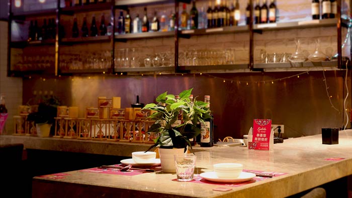 主題餐廳酒架設(shè)計:酒架位于吧臺的內(nèi)部墻體之上,酒架的引入改變了空間單調(diào)的空間氛圍,在一定程度上讓空間更有活力,將空間變的活力十足。