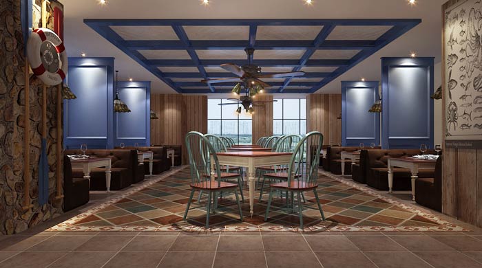 主題餐廳過道休息區設計:逼真的海上場景布置,讓人仿佛回到了航海時期,仿佛徜徉在廣闊的大海中,實木桌椅的設計,讓人感受到最原始的真實。