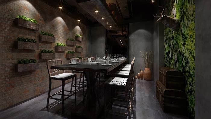 特色主題餐廳隔斷設(shè)計:建筑本身的柱體,也被設(shè)計師很好的加以改造與利用,設(shè)計師將八人桌很好的,嵌入柱體與柱體之間,同時利用展架阻隔空間,讓設(shè)計貼合建筑本身。