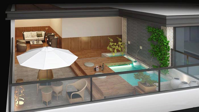 頂層溫泉的設計:此處主要是為勞累了一天的客戶們,提供一處休閑之地,讓大家在這里可以泡泡澡、喝喝茶、嘮嘮嗑、談談生活,在這里休閑達到一種頂峰,此處旨在去除人的疲勞,此處也是酒店的一大亮點,酒店的理念就是在任何時候,都可以為客戶帶來驚喜。