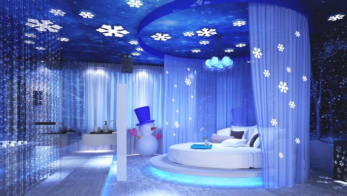 瑞雪客房的設計:正所謂瑞雪兆豐年,這是古代先賢總結的自然規則,其中包括了雪的重要性,我們躺在床上雪花隨風飄揚而下,讓我們仿佛置身在大雪紛飛之中,一旁雪人為我們站崗放哨,此處不管是夏季還是冬季,對于客戶來說都是一個不錯的場所,讓我們在此地見證大自然的神奇與美麗。