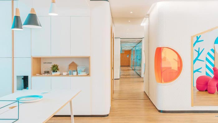 前臺(tái)區(qū)域的設(shè)計(jì):設(shè)計(jì)師在設(shè)計(jì)的時(shí)候,采用白色做為主色調(diào),其中加入了藍(lán)色、褐色等各種色彩,白色為主色調(diào)給人一種溫暖、明亮的感覺(jué),其他顏色做為點(diǎn)綴之用,白色本身就有向外散發(fā)的屬性,可以在一定程度上提升空間的視覺(jué)感受。