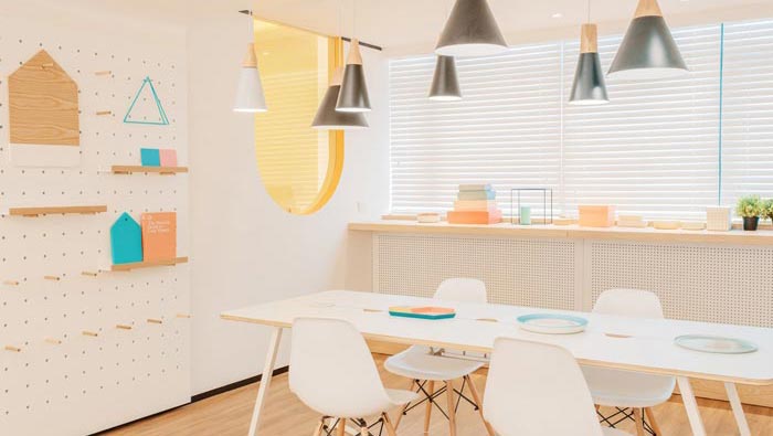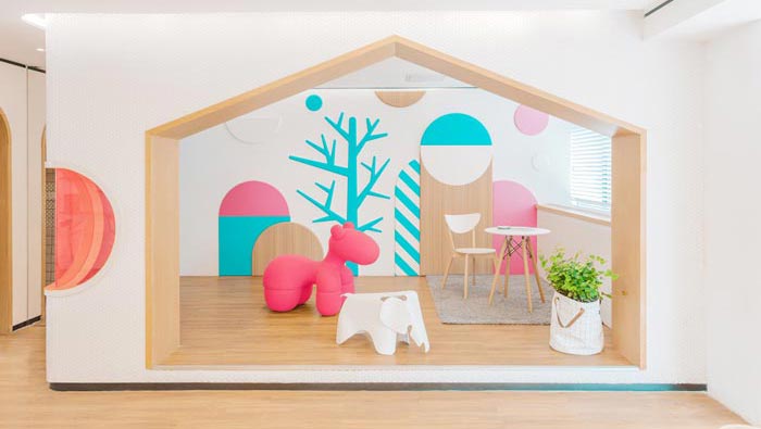 接待區(qū)域的設(shè)計(jì):在設(shè)計(jì)上設(shè)計(jì)師加入了調(diào)皮、溫馨的元素,但是在元素的控制上設(shè)計(jì)師顯得十分小心,讓彼此之間都不會(huì)感到反感,因?yàn)椴还軐?duì)于孩子還是對(duì)于大人來(lái)說(shuō),對(duì)于元素的認(rèn)可度都是不同的,所以設(shè)計(jì)師做了多次調(diào)研,最后將其控制在一定的比例之內(nèi),讓大人、小孩感受的元素是完全不同的。