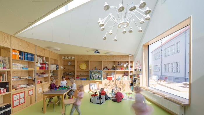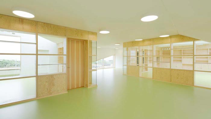 教室內(nèi)部的設計:內(nèi)部有膠合板制成的“書柜墻”圍繞在空間的四周,與綠色地板一起構(gòu)成了整個空間的格局,這樣的設計為整個空間創(chuàng)造出,流暢的空間體驗和一致性和透明度,讓孩子們在這里成長、在這里積累知識、在這里見證自己的童年。